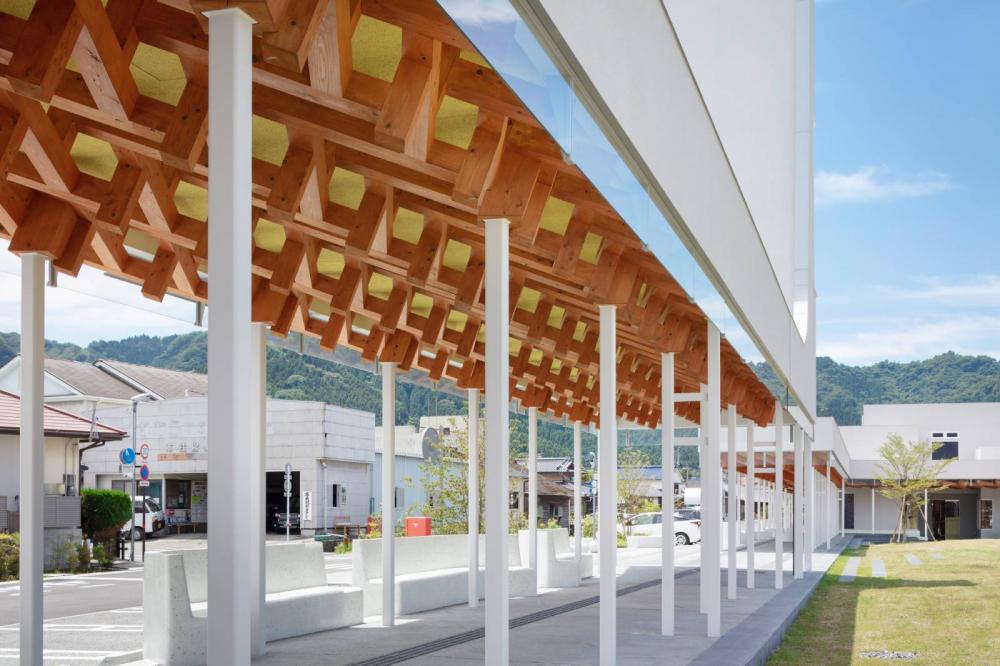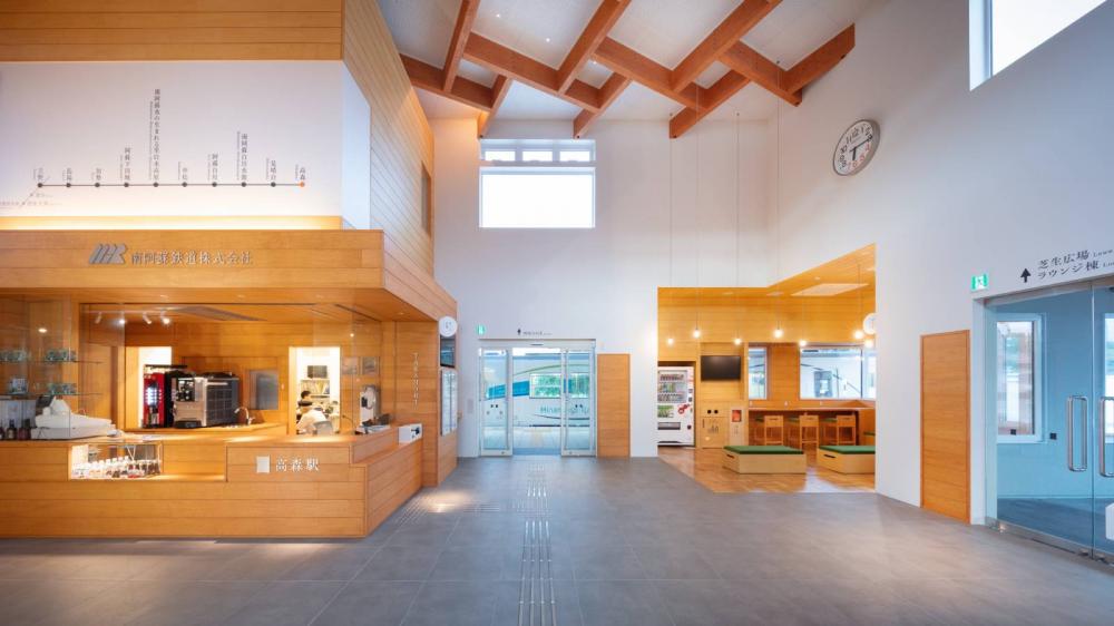 「とにかく広いプラットフォーム」を中心に、両側に位置する駅舎と防災交流施設のR階梁にはヒノキ集成材によるレシプロカル格子、庇にはスギ製材によるレシプロカル格子が採用されており、プラットフォーム上屋と、回廊には高森駅用に開発された「修羅組み」が採用されている。複雑に見える見た目と名前とは裏腹に、一般流通材を用いて長いスパンを実現できること。柱頭と束以外は直交加工で済むこと。束間隔を野地板の貼りやすい寸法にすること等の木材利用に配慮した設計となっていることに加えて、Grasshopperによる設計データをプレカット工場のCADと連携させることで精度の高さと製造時間の短縮を実現した架構であり、部材の製造効率だけではなく、施工面でも地組みをした部材を上から落とし込んでシンプルに組み上げる工夫が盛り込まれている。