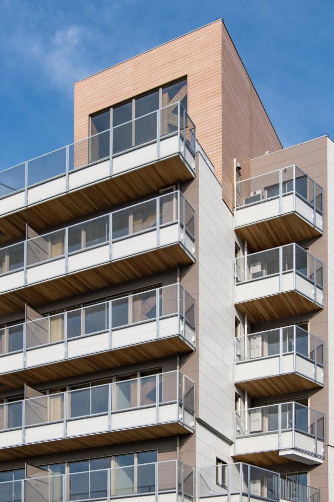 上階の木造部分は軸組工法となっており、柱・梁には国産カラマツ材のLVLが用いられている。耐震要素としては、下層のより耐力が必要な部分ついてはカラマツLVLの耐震ブレース、上層で構造的負担の少ない箇所にはスギCLTの耐震壁がそれぞれ用いられ、さらには7~8階のオーナー住戸の一部には1時間耐火性能を持った難燃薬剤処理LVLも用いられており、まさに都市木造に必要なLVLによる様々な技術が適材適所に組み込まれている。