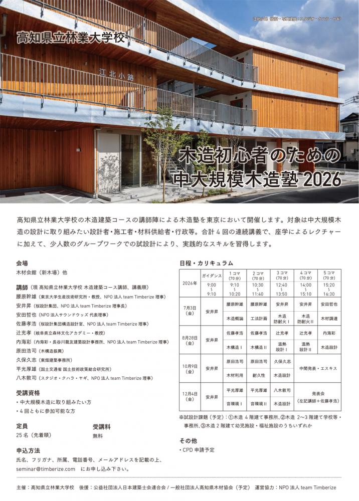 高知県立林業大学校「木造初心者のための中大規模木造塾2026(東京)」参加者募集について